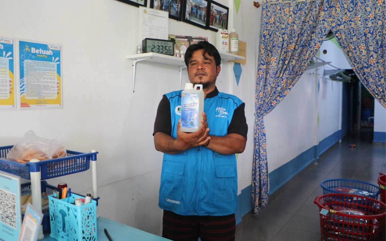 Sabun untuk kebutuhan laundry tidak dibeli, melainkan diproduksi sendiri dan ramah lingkungan, karena terbuat dari bahan baku tumbuhan liar yang banyak ditemukan di sekitar pekarangan rumah. “Namanya, rumput teki,” kata Tim CSR PT KPI RU II Dumai, Fajar Julian Santoso.